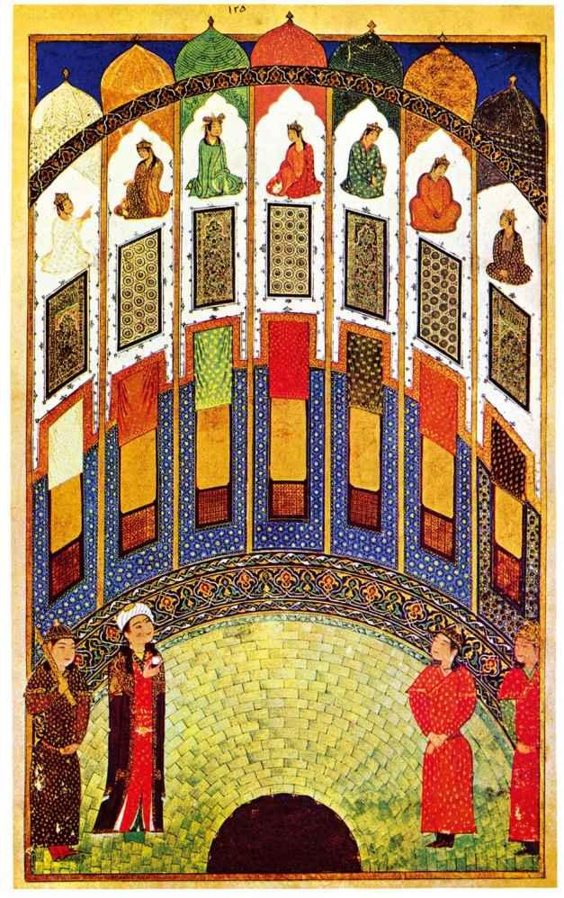 内扎米《七美图》插图作者:不详作者:1410年流派:前期设拉子画派原图尺寸:24.2×15厘米收藏在里斯本古尔班基扬基金会