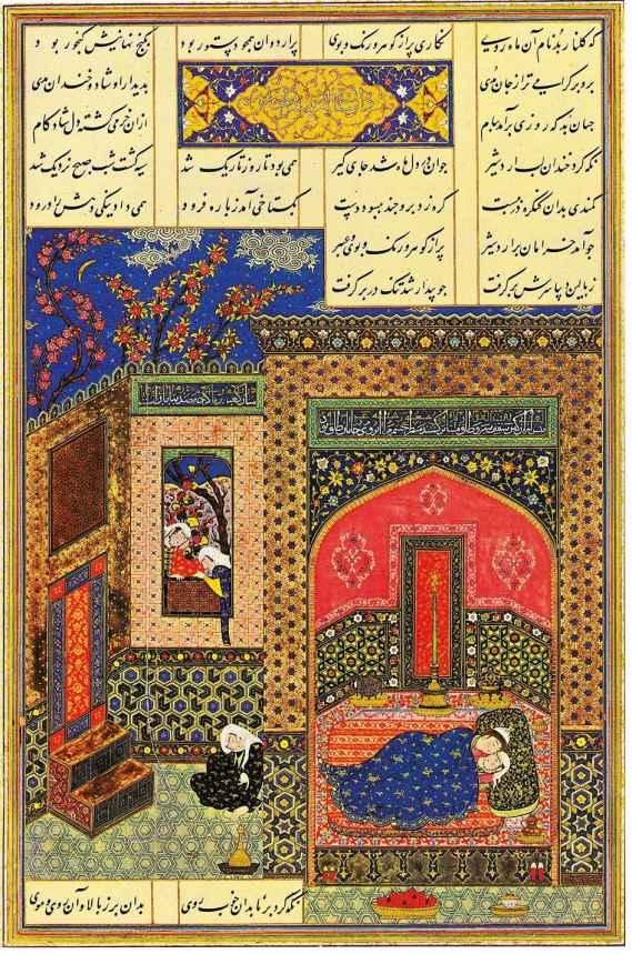 我决定讲一个故事来回答:“很久以前,有一位君王统治着伊斯法罕。他是绘画书籍的爱好者,独自居住在他的城堡里。他是一位伟大、强壮、有智慧但冷酷的国王,生平只爱两件事:他委托制作的手抄绘本,以及他的女儿。君王对自己的女儿钟爱有加,十分溺爱,他的敌人宣称他根本是爱上了她,这一点都不为过。因为骄傲又善妒的君王,甚至向派遣使者前来提亲的邻国王子与君主宣战。自然,全世界没有任何男人配得上他女儿。他甚至把她监禁在一个房间,屋外以四十扇门牢牢锁住。因为依照伊斯法罕的一项风俗信仰,他相信如果自己的女儿被别的男人看见,她的美貌将会消失。有一天,当他委托制作的一本《霍斯陆与席琳》以赫拉特风格绘画并抄写完成后,一个谣言在伊斯法罕流传了开来:书本里有一张热闹的图画,其中有一个肌肤若雪的美女,不是别人,正是善妒君王的女儿!甚至在听闻流言之前,君王便已经对这幅神秘插画起疑,他颤抖着双手翻开书页,泪如雨下地看见女儿的美貌确实出现在画中。故事的发展,并不是被保护在四十扇门后的君王的女儿,某天夜里溜出去给人绘画,而是她的美貌像一个郁闷窒息的幽魂,透过镜子的层层反射,如一丝光线或一缕青烟,溜出门下的缝隙及钥匙孔,映入了一位彻夜工作的插画家的眼中。技艺精湛的年轻细密画家忍不住把这位美得令他不敢直视的佳人,画入手边正在进行的图画之中。那幅画的场景描绘的是席琳在一次郊外野游中,看见了霍斯陆的画像,因而坠入爱河。”
