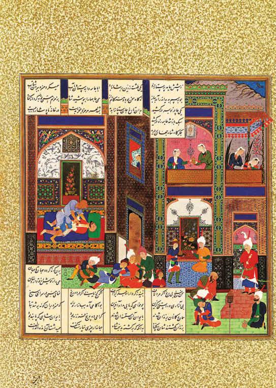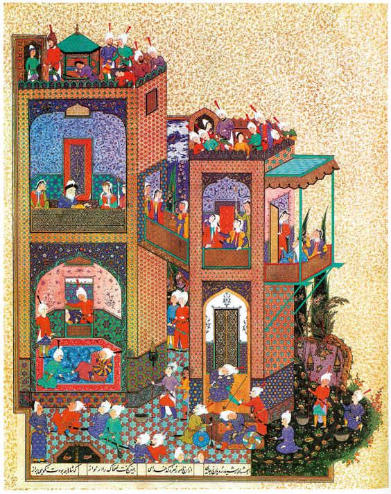 我的这个比喻,取自于克尔曼的阿布·萨伊德,他在撰述帖木儿子孙的《历史》一书中,收入了许多设拉子与赫拉特前辈大师们的故事。一百五十年前,黑羊王朝的统治者贾杭君王举兵东进,打败当时帖木儿王朝自相残杀的大小君主,击溃军队,劫掠领地(黑羊王朝君主贾杭王(1435—1467年在位),于1440年夺取伊拉克地区,1446年攻占波斯本土法尔斯地区和克尔曼地区。)。接着,他率领手下战无不胜的土库曼军队,穿越整个波斯,来到东方。最后,在阿斯特拉巴德(阿斯特拉巴德:即下文的古尔甘,伊朗北部靠近里海东岸的城市。阿斯特拉巴德是古称,后来改称古尔甘。),他击败了易卜拉欣(即米尔扎·阿布杜拉·本·易卜拉欣(1450—1451年在位),是帖木儿第四子沙哈鲁的第三子易卜拉欣·苏尔丹之子。易卜拉欣·苏尔丹曾在法尔斯地区任设拉子总督20年(1414—1433年),创建了细密画“设拉子前斯画派”。阿布杜拉·本·易卜拉欣并非被黑羊王朝的贾杭王击败,而是被帖木儿第三子米朗王的孙子苏尔丹·阿布·萨伊德(1451—1469年在位)在撒马尔罕城附近击败并被杀死。苏尔丹·阿布·萨伊德在撒马尔罕地区统治十八年,大力推崇细密画。)——帖木儿之子沙哈鲁的孙子。占领古尔甘(古尔甘:伊朗北部靠近里海东海岸的城市。)之后,他派遣军队进攻赫拉特城。(贾杭王于1458年征服赫拉特。)根据克尔曼的历史学家记载,这场战争,不只撼动了全波斯,更消灭了帖木儿王室至此全胜无敌的势力;这个王朝,半世纪以来统治了半个世界,领土从印度延伸到拜占庭。赫拉特的围城造成空前的毁灭灾难,男女老少哀鸿遍野,整座城市宛若人间炼狱。历史学家阿布·萨伊德以某种残酷的快感,向读者描述围城的场景:黑羊王朝的贾杭君王进入他攻占的城堡,冷血地杀光了所有帖木儿的后裔;(史实是贾杭王在1458年征服赫拉特之后不久便后院起火,其儿子在阿塞拜疆地区反叛,欲自立为王,贾杭王不得已主动与占据撒马尔罕的苏尔丹·阿布·萨伊德媾和,将赫拉特交还给帖木儿的重孙苏尔丹·阿布·萨伊德,率军返回自己的首都大不里士,镇压了儿子的反叛。真正彻底击败帖木儿后裔在中亚地区统治地位的是乌孜别克人的昔班王朝和伊朗萨沙维王朝开国君主伊斯玛仪一世。)他到众君王和王子的后宫挑拣嫔妃,把她们纳入自己的后宫;他无情地隔离每一个细密画家,强迫他们服侍他自己的绘画大师,充当他们的学徒。阿布·萨伊德的《历史》写到这里,笔锋一转,不再描写躲在城堡高塔的墙垛后,试图反击敌军的君王和战士,而把焦点转向画坊的细密画家们:身陷画笔和颜料堆中的他们,等待着围城达到恐怖的顶点,走向无法逃避的结局。他列出了画家们的姓名,一个接一个述说他们如何举世闻名,并且将永垂不朽。然而,如同君王的后宫佳丽们,如今早已为人淡忘的这群彩绘大师,困在画坊中什么事都不能做,只能相拥而泣,共同回忆过去的幸福岁月。